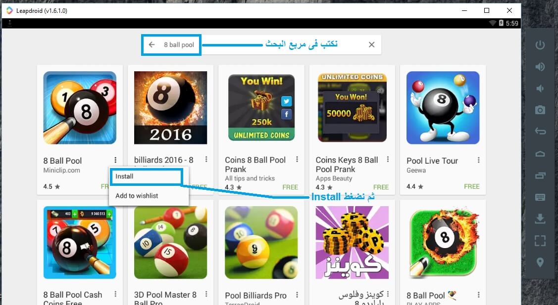 فى الشريط الجانبى الموجود على يمين الشاشة تتطيع التحكم فى مستوى الصوت وفتح الكاميرا واغلاق البرنامج والعديد من الخيارات الاخرى, الان نقوم بالتوجة الى متجر جوجل بلاى لتحميل الالعاب التى نريدها وفى هذا الشرح نقوم بتحميل لعبة 8BallPool.