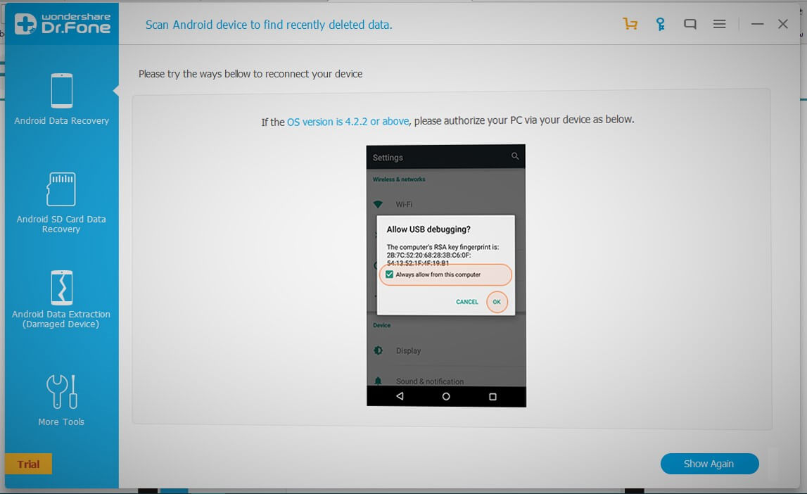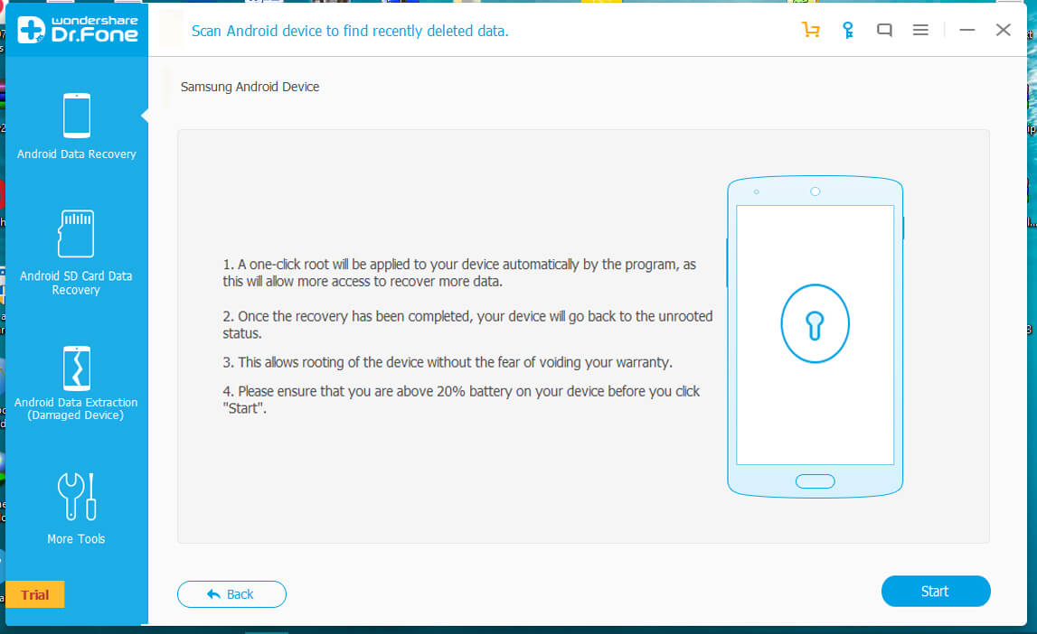 فى هذة الخطوة يخبرك البرنامج بأنه سوف يفعل الروت لهاتفك لمساعدتة فى عملية استعادة الصور والفيديوهات المحذوفة وان عملية الروت لن تخرج الجهاز من الضمان ولا داعى للقلق لأنة سوف يقوم بازالة الروت مرة اخرى بعد الانتهاء من العمل فى استرجاع الصور والفيديوهات والملتيميديا الخ,..
