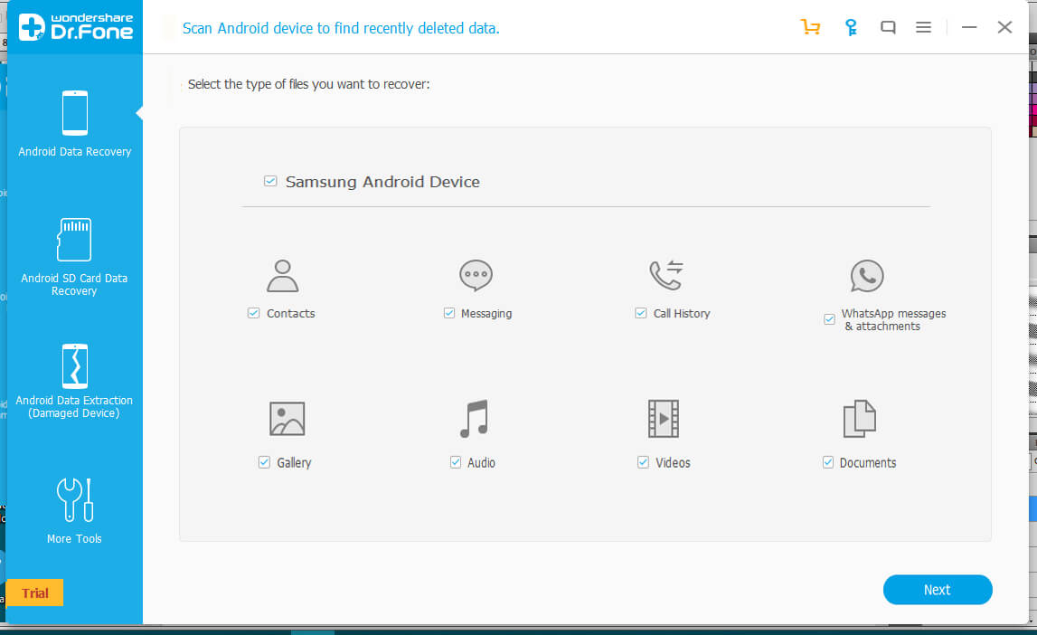 اختار نوع الملفات التى تريد استعادتها من هاتف الاندرويد الخاص بك, حدد على النوع الذى تريد استرجاعة فقط واضغط Next.